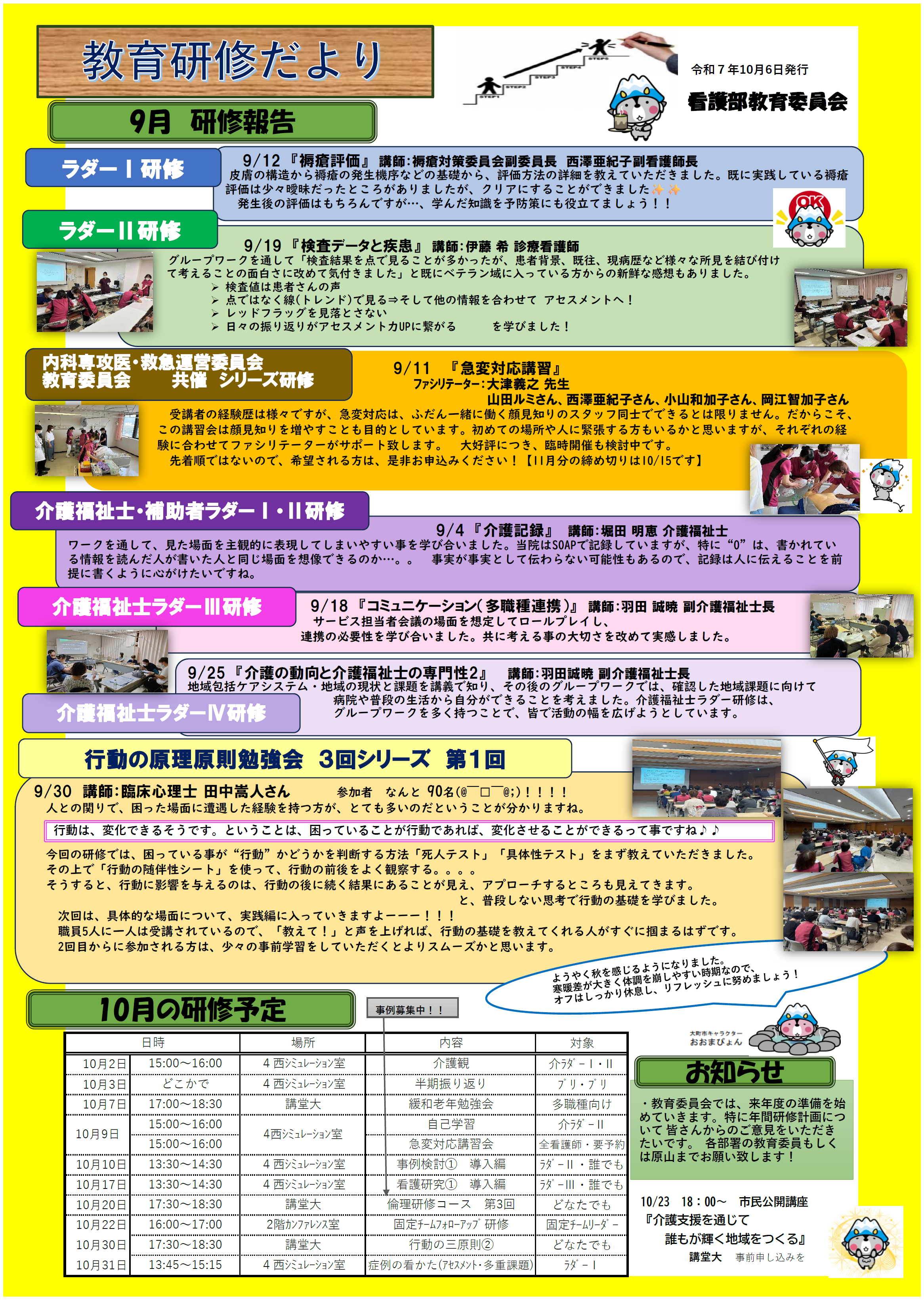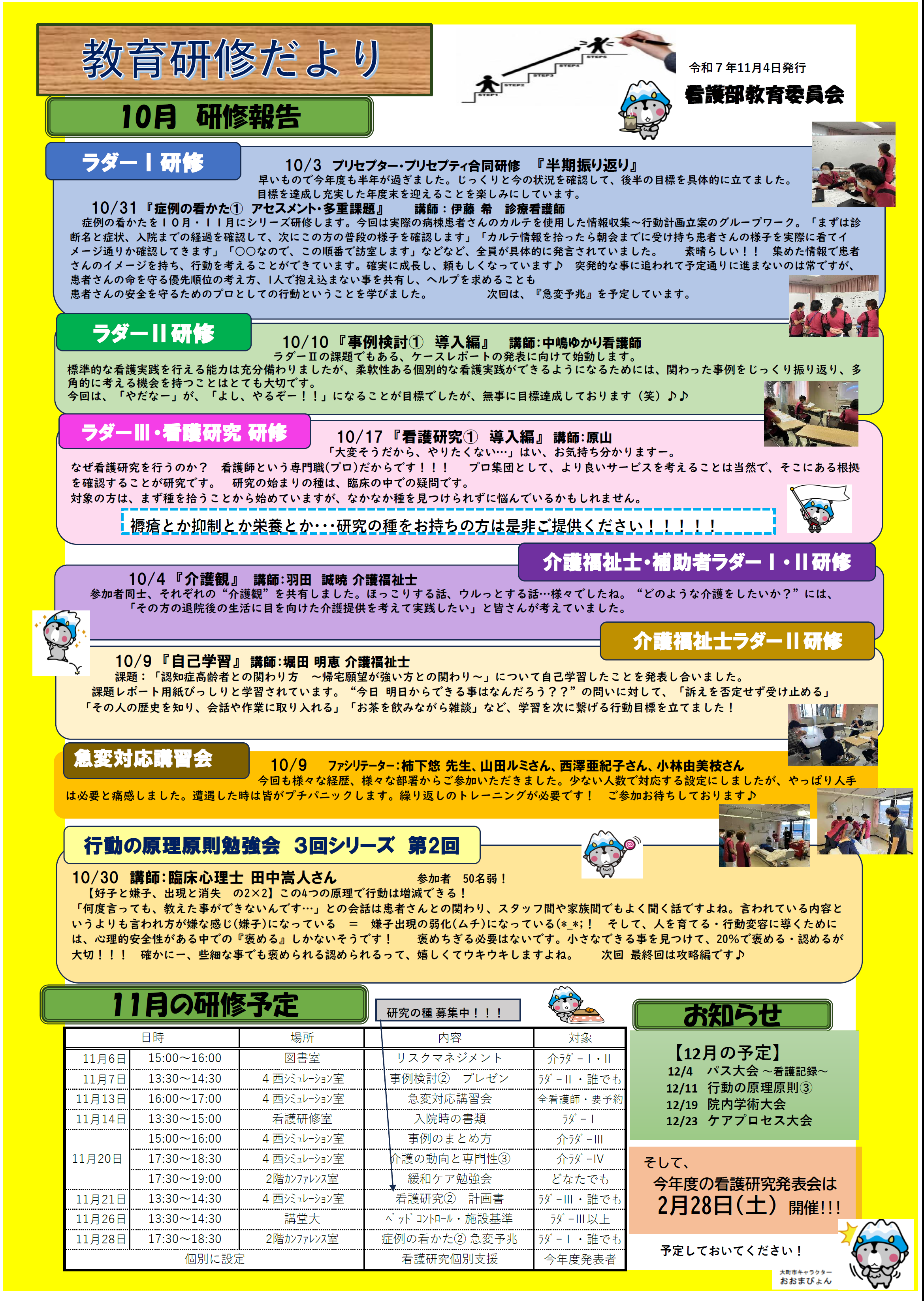 当院 看護部では、クリニカルラダー※を活用した人材育成とキャリア支援を行っています。安全で良質な医療を提供するため、日々研修に取り組んでおります。実施した研修については、「教育研修だより」として院内へ報告し、職員のスキルアップに努めております。