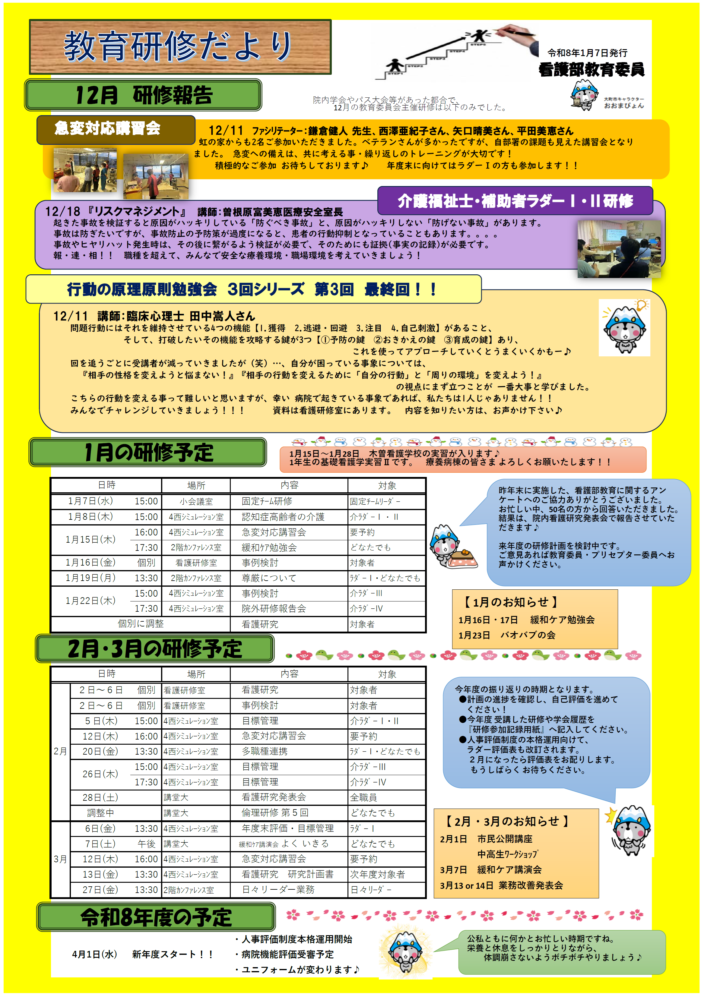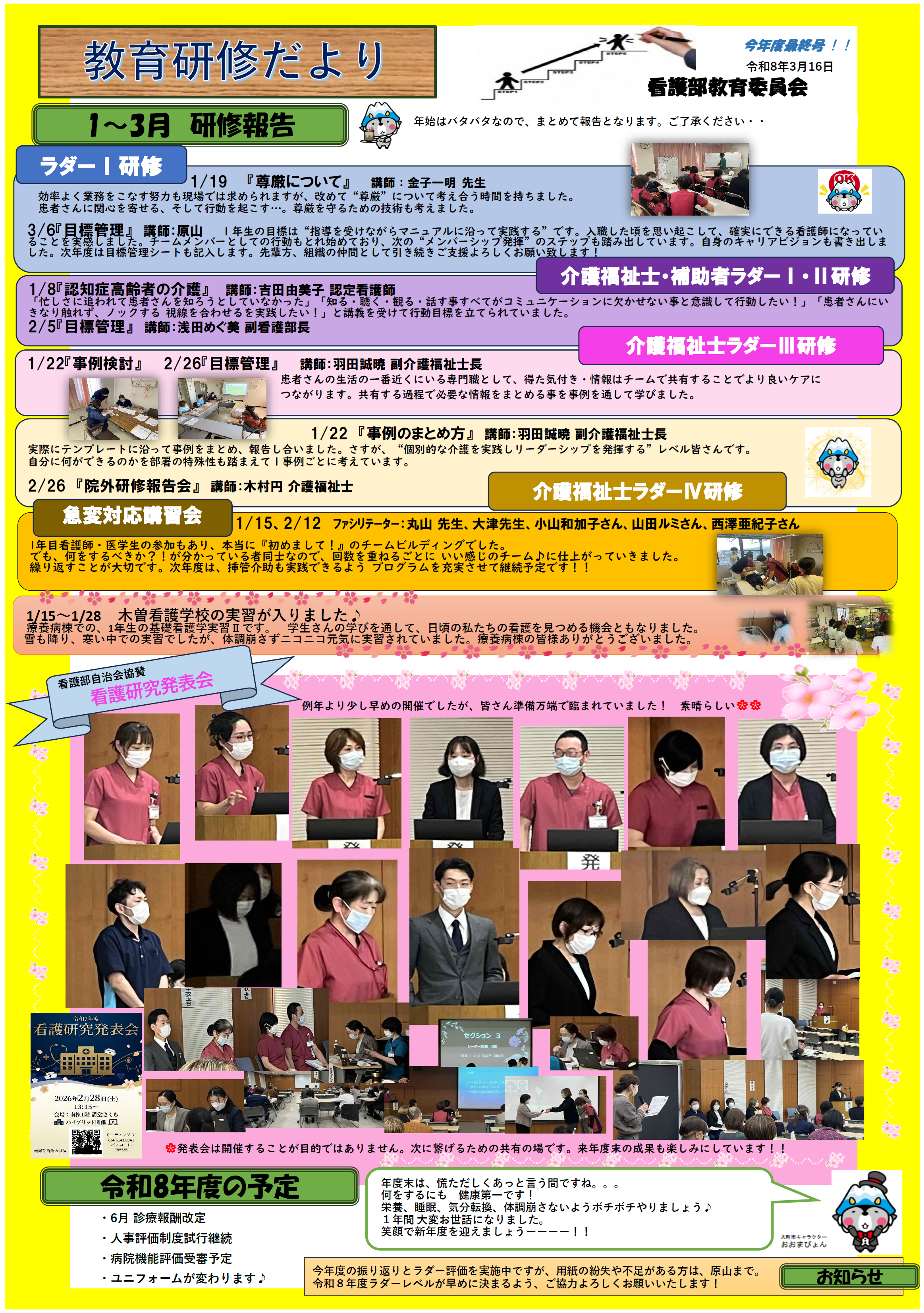当院 看護部では、クリニカルラダー※を活用した人材育成とキャリア支援を行っています。安全で良質な医療を提供するため、日々研修に取り組んでおります。実施した研修については、「教育研修だより」として院内へ報告し、職員のスキルアップに努めております。