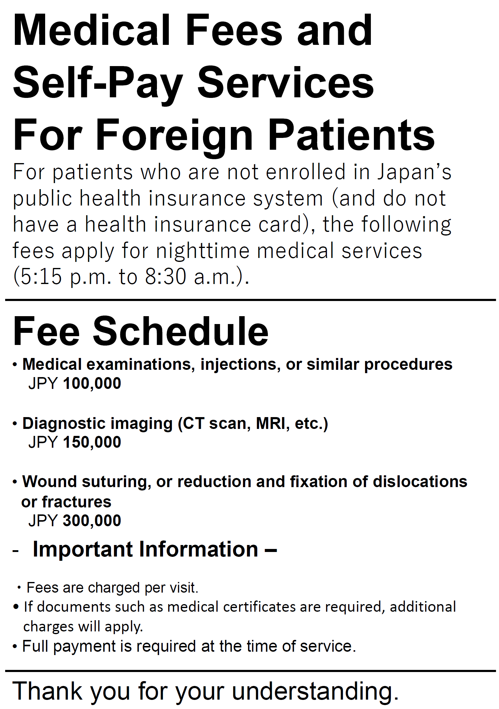 時間外の医療費等は「預り金」でお支払いいただき、後日の精算となりますので、予めご了承ください。